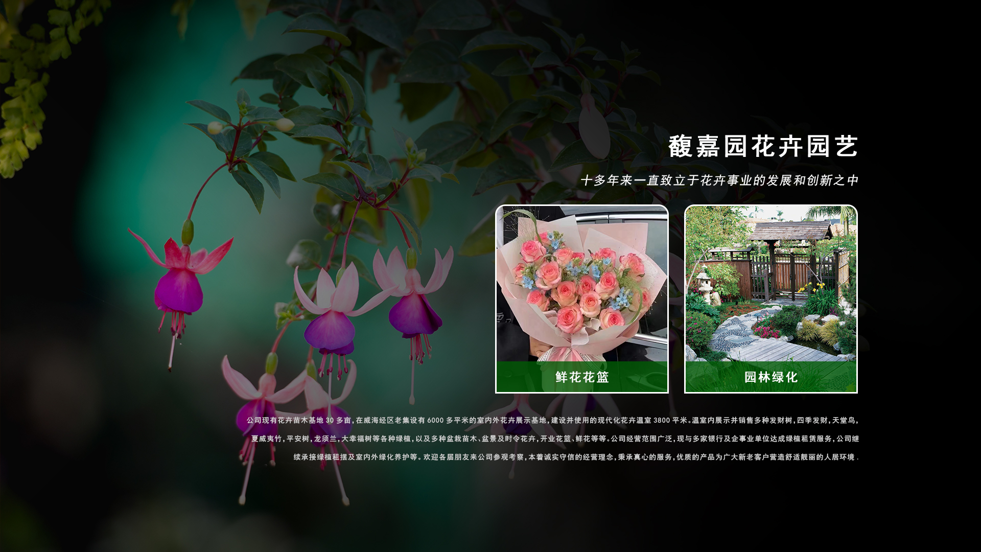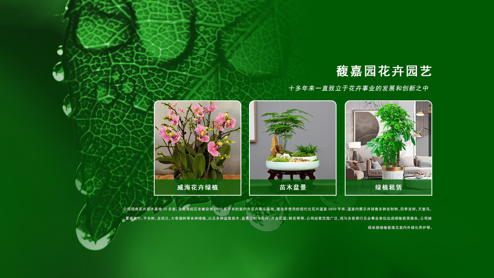 威海市馥嘉園花卉園藝有限公司成立于2009年,十多年來(lái)一直致立于花卉事業(yè)的發(fā)展和創(chuàng)新之中。公司現(xiàn)有花卉苗木基地30多畝,在威海經(jīng)區(qū)老集設(shè)有6000多平米的室內(nèi)外花卉展示基地,建設(shè)并使用的現(xiàn)代化花卉溫室3800平米。溫室內(nèi)展示并銷售多種發(fā)財(cái)樹,四季發(fā)財(cái),天堂鳥,夏威夷竹,平安樹,龍須蘭,大幸福樹等各種綠植,以及多種盆栽苗木、盆景及時(shí)令花卉,開業(yè)花籃、鮮花等等。公司經(jīng)營(yíng)范圍廣泛,現(xiàn)與多家銀行及企事業(yè)單位達(dá)成綠植租賃服務(wù),公司繼續(xù)承接綠植租擺及室內(nèi)外綠化養(yǎng)護(hù)等。